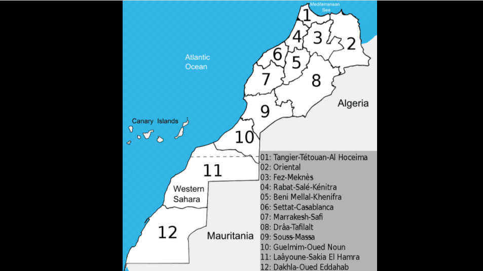 Per darti una visuale d’insieme di come è distribuito il Territorio, ti riportiamo una mappa con la indicazione delle 12 Regioni del Marocco.